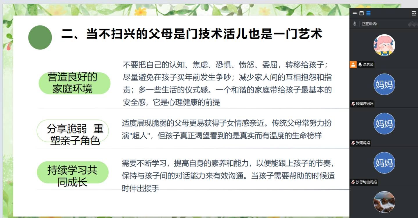 本次课堂以“守护心灵绿洲”为主题,主要围绕“做不扫兴的父母;积极沟通、让爱流动;面对心理问题有抓手”三个主题展开探讨,班主任结合实际案例进行深入剖析,为家长们提供具体的应对策略与沟通技巧。活动过程中,家长们更直观地感受到沟通方式的差异对亲子关系的影响,纷纷表示受益匪浅,收获颇丰。